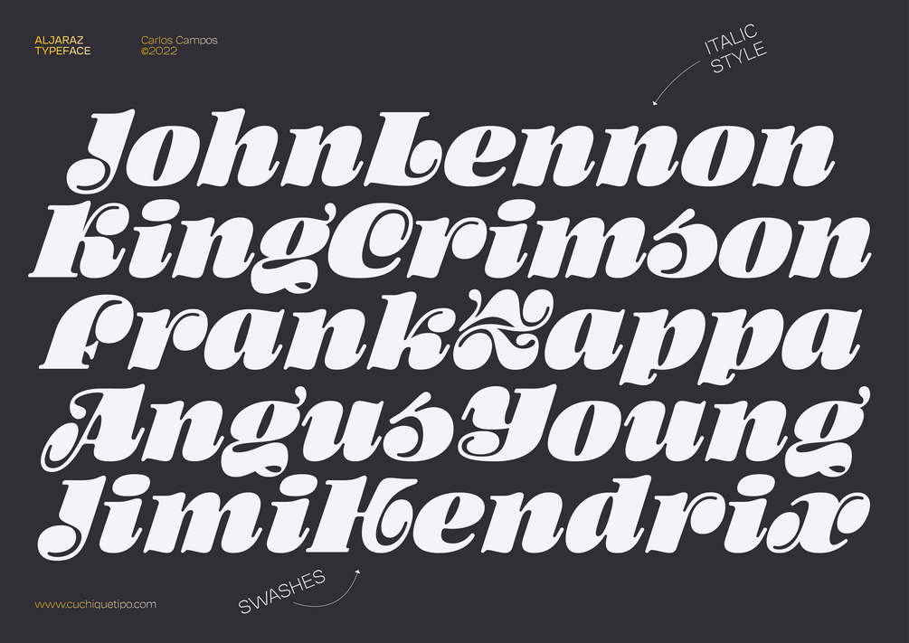Aljaraz has a regular and italic variable, and in both styles the capital letters have a swash alternative where the naughty touch reaches its maximum expression. It is ideal to recall the lysergic era of the 60s, write funny words, or simply to express small texts in a display way that powerfully attracts attention.